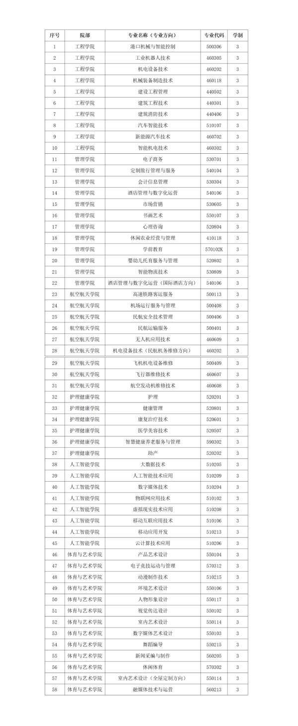 学校面向服务区域经济发展需求办学,设有护理健康学院、工程学院、人工智能学院、管理学院、体育与艺术学院、航空航天学院等六个二级学院及思政教学部、基础教学部等教学单位。现有专业61个,专业设置涵盖机电工程、护理健康、人工智能、管理服务、体育、艺术等方向。