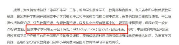 教育部整合国家、有关省市和学校优质教学资源,在延期开学期间开通国家中小学网络云平台和中国教育电视台空中课堂,免费供各地自主选择使用。平台资源包括防疫知识、红色教育资源、专题教育资源,以及从小学至普通高中的主要学科课程资源,课程时间一般在20分钟左右。国家中小学网络云平台(网址:ykt.eduyun.cn)自2月17日起开通。同时,中国教育电视台4频道通过直播卫星户户通平台向全国用户传输有关课程,覆盖偏远农村网络信号弱或有线电视未通达地区。为丰富学习资源,还组织部分省级教育部门及中小学免费向全国开放网络学习平台或网校。