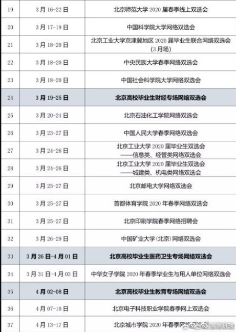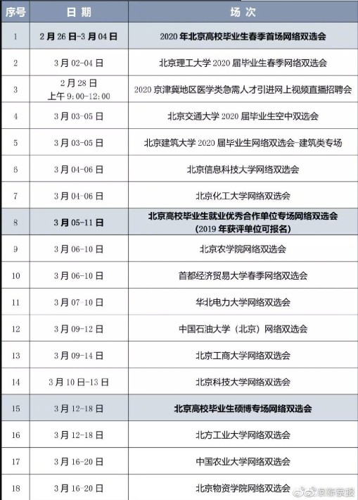 自2020年2月26日起,不同主题的网络双选会将陆续举办,每场双选会持续时间为3-7天。